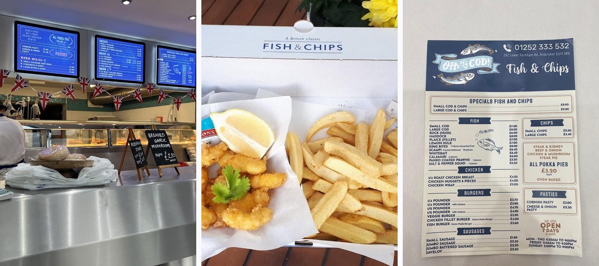 Welcome to Oh My Cod, your go-to destination for delicious fish and chips in Aldershot! Located at 282 Lower Farnham Rd, we specialize in serving mouthwatering dishes that are perfect for solo dining, lunch, or dinner. Our diverse menu offers late-night food and a delightful kids' menu, ensuring there's something for everyone. Enjoy a casual atmosphere with options for takeaway, delivery, and dine-in. With wheelchair-accessible facilities, free parking, and a commitment to exceptional customer service, Oh My Cod is a family-friendly spot you don't want to miss. Experience the joy of hot, fresh seafood at an amazing value!The fish and chips at Oh My Cod consistently receive rave reviews for their freshness and generous portions. Many patrons appreciate the standout service from friendly staff, who often go above and beyond to ensure a pleasant dining experience. The chips are cooked to perfection—crispy and golden on the outside, fluffy on the inside—complementing the well-seasoned fish beautifully.