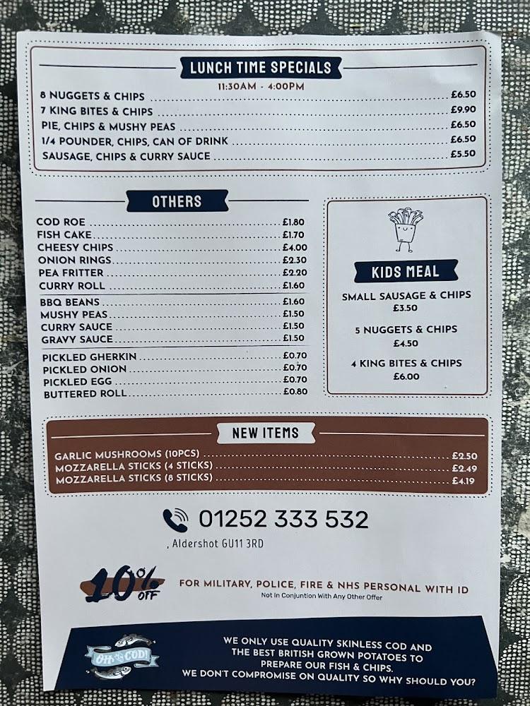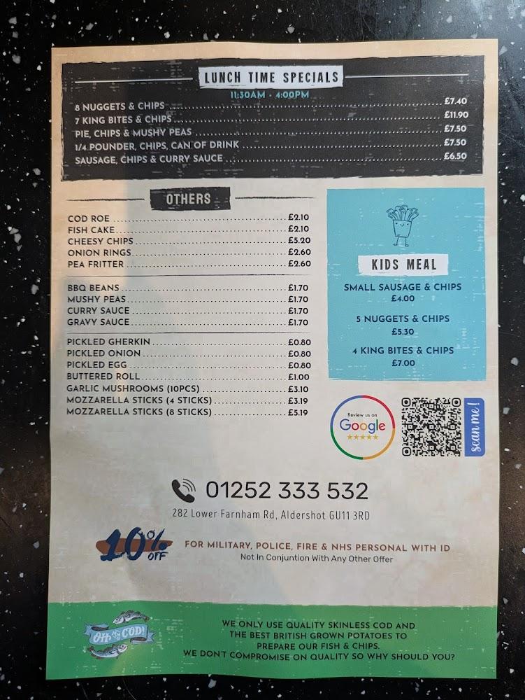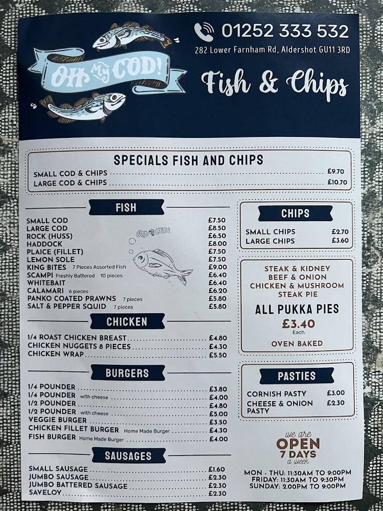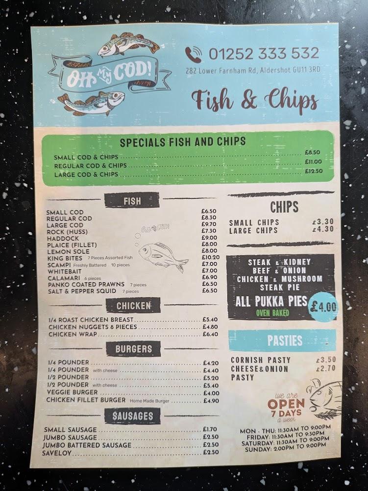 Nestled at 282 Lower Farnham Rd, Aldershot, Oh My Cod serves as a cherished culinary spot that captures the essence of traditional British fast food. With its casual, inviting vibe, it has become a go-to destination for quick bites and fulfilling meals. Accessibility is a strong suit here. The venue boasts a wheelchair-accessible entrance, seating, and parking facilities, ensuring everyone can enjoy their famous fish and chips. Despite being a takeout restaurant, there are options for dine-in, making it perfect for those who want to savor their meal on-site.